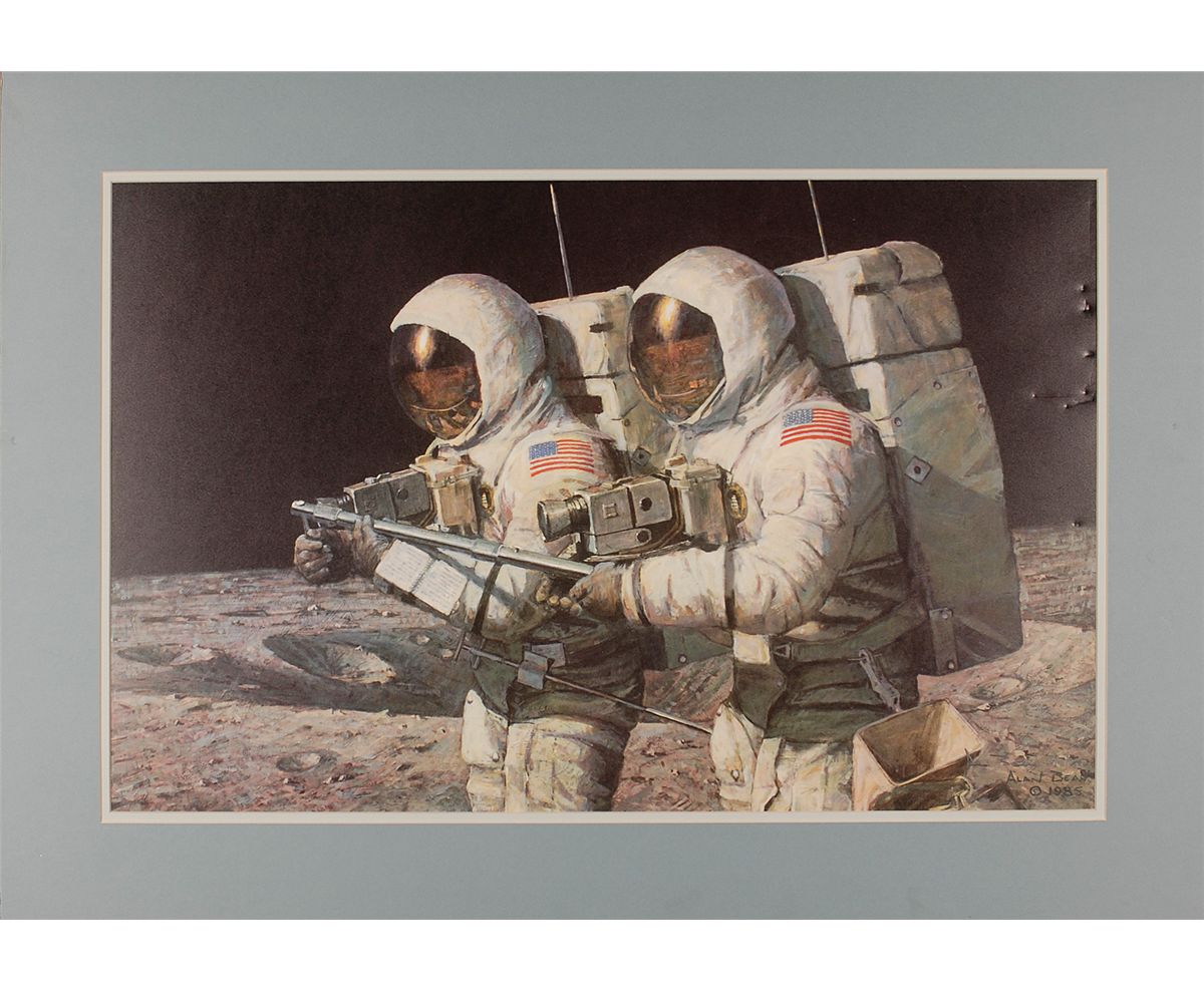 Color limited edition 27.5 x 17.5 print entitled ‘Helping Hands,’ numbered #695/850, signed in pencil by Bean. Double matted to an overall size of 34 x 24. Moderate signature contrast against dark background, and surface dings and impressions mainly along right edge, otherwise fine condition. Oversized.
