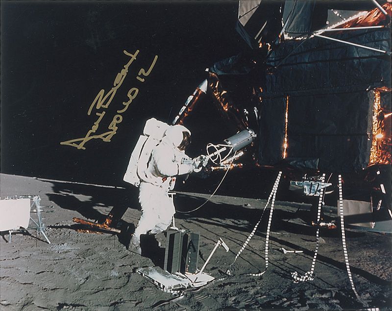 Two color satin-finish photos, one 8 x 10 of Bean during training, signed in blue felt tip; and one of Bean on the moon, signed in gold ink. In fine condition.
