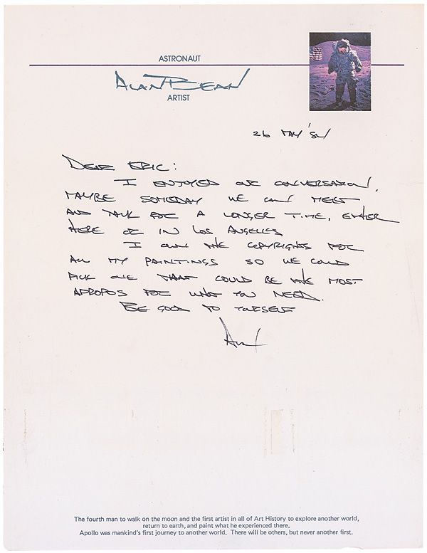 ALS signed “Alan,” one page, 8.5 x 11, personal letterhead, May 26, 1984. Letter to Eric. In part: “I enjoyed our conversation. Maybe someday we can meet and talk for a longer time…I own the copyrights for all my paintings so we could pick one that could be the most apropos for what you need.” In fine condition, with scattered light creases and a small tape remnant along bottom blank portions.