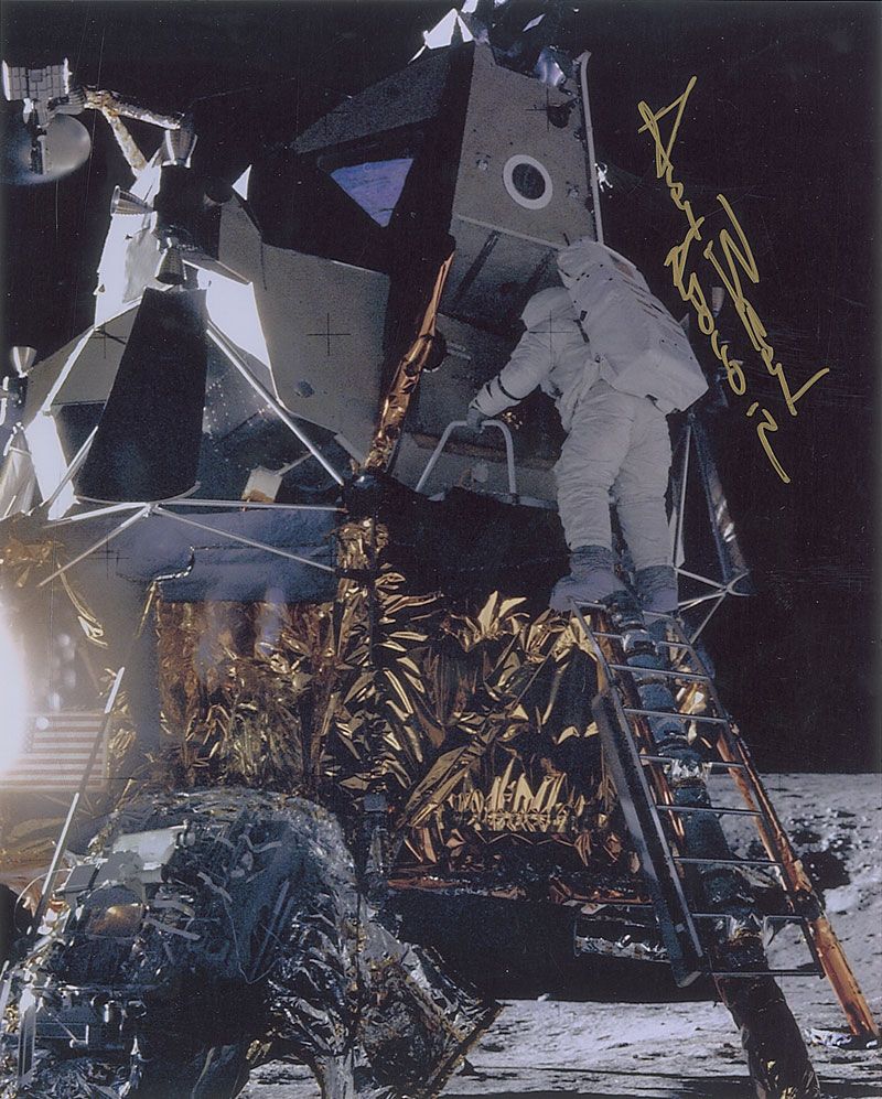 Color glossy 8 x 10 photo of Bean on the moon, signed in gold ink, “Alan Bean, Apollo 12.” In very fine condition.