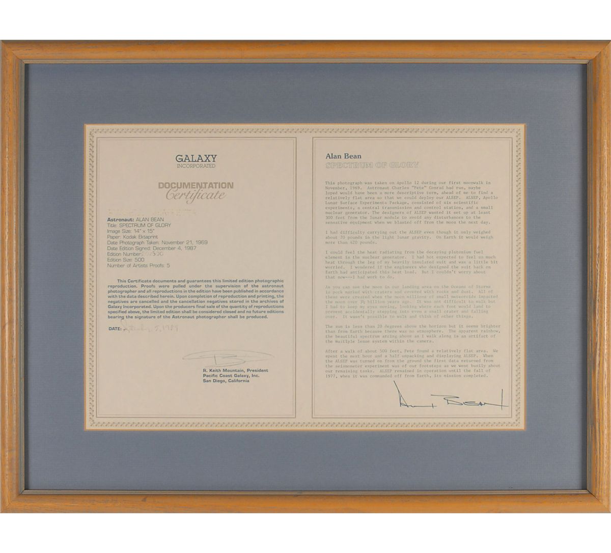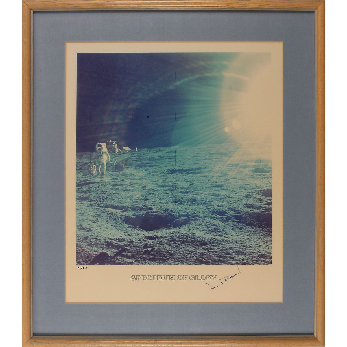 Limited edition photo reproduction entitled ‘Spectrum of Glory,’ 15.5 x 18.5, #20/500, of Pete Conrad working on the lunar surface during the first moonwalk of Apollo 12, signed in the lower border in black felt tip. Matted and framed to an overall size of 21.5 x 25. In fine condition. Accompanied by a documentation certificate from Pacific Coast Galaxy Inc., which also bears a printed narrative by Bean, matted and framed to an overall size of 20.5 x 16. Oversized.