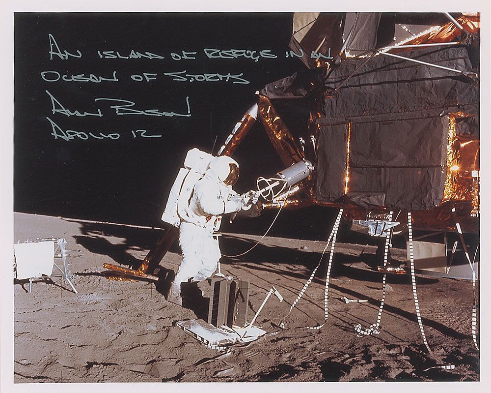 Color satin-finish 10 x 8 photo of Bean conducting experiments on the lunar surface, signed in silver ink, “An island of refuge in an ocean of storms. Alan Bean, Apollo 12.” In very fine condition.