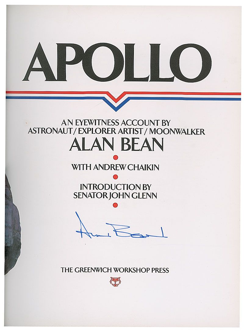 Signed book: Apollo: An Eyewitness Account. First edition, first printing. Shelton, CT: Greenwich Workshop Press, 1998. Hardcover with dust jacket, 9.5 x 12.25, 176 pages. Signed by Alan Bean on the title page in blue felt tip. In fine condition.
