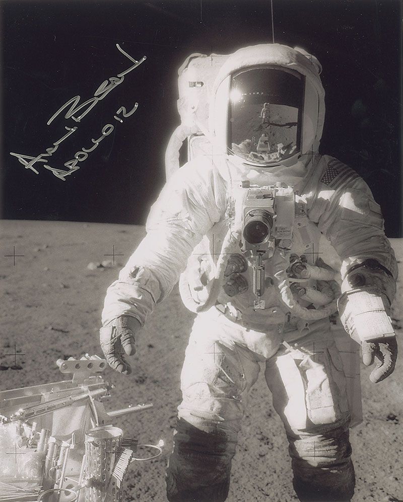 Glossy 8 x 10 photo of Bean on the lunar surface, signed in silver ink, “Alan Bean, Apollo 12.” In very fine condition.