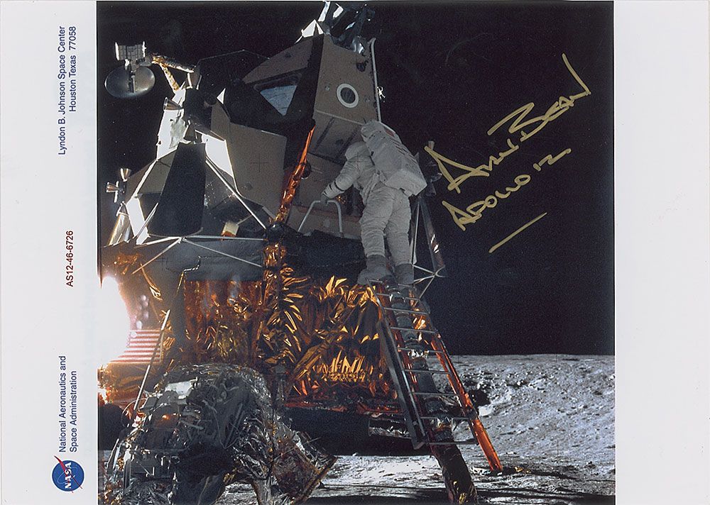 Color glossy 11 x 8 NASA ‘red-numbered’ photo of Bean descending the LM ladder onto the lunar surface, signed in gold ink, “Alan Bean, Apollo 12.” In very fine condition.