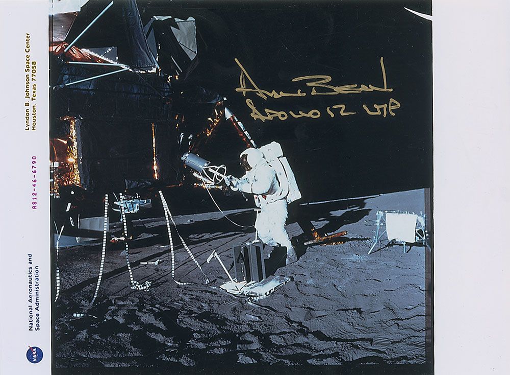 Color glossy 10 x 8 ‘red-numbered’ NASA photo of Bean walking on the moon, signed in gold ink, “Alan Bean, Apollo 12 LMP.” In fine condition.