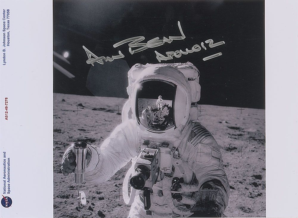 Color glossy 10.75 x 8 ‘red-numbered’ NASA photo of Bean on the lunar surface, signed in silver ink, “Alan Bean, Apollo 12.” In fine condition.