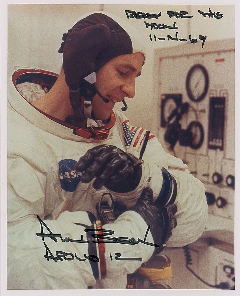Color satin-finish 8 x 10 photo of Bean suiting up for his Apollo 12 flight, signed in black felt tip, “Ready for the moon 11-14-69, Alan Bean, Apollo 12.” In very fine condition.