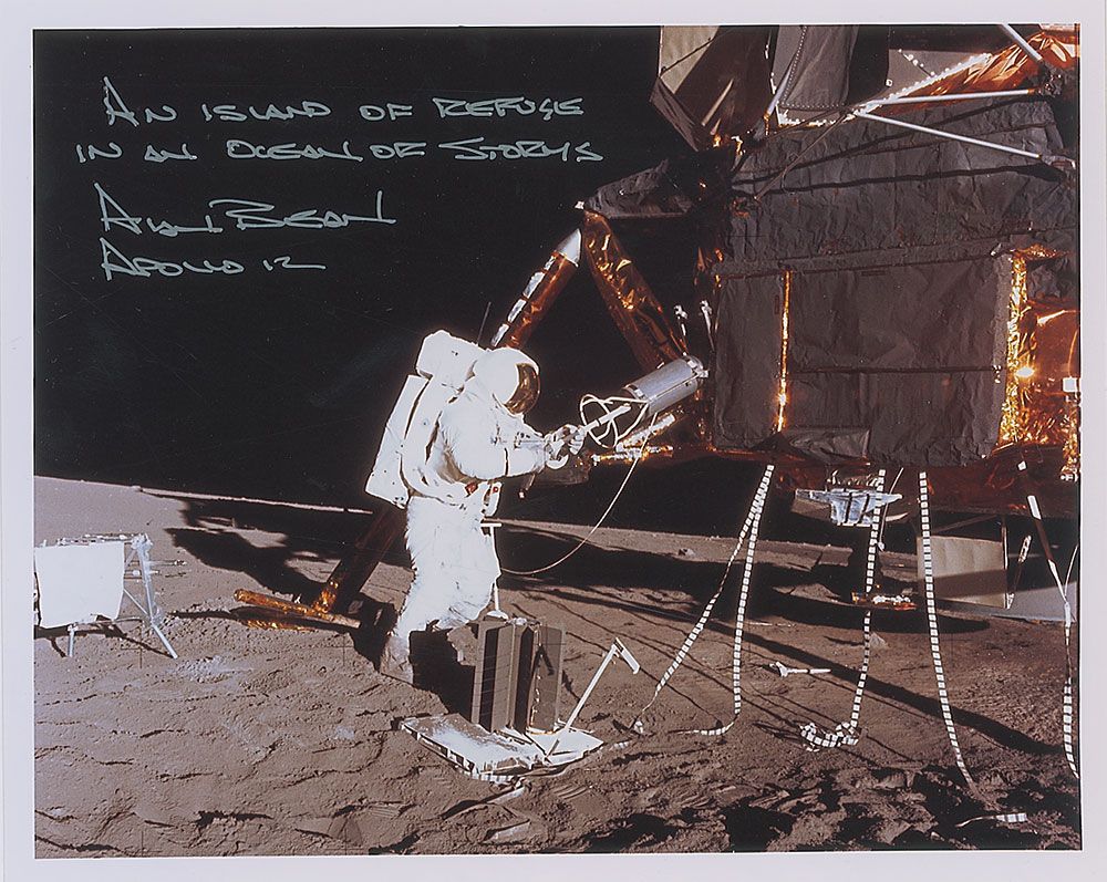 Color satin-finish 10 x 8 photo of Bean working on the lunar surface by the lander, signed in silver ink, “An island of refuge in an ocean of storms, Alan Bean, Apollo 12.” In very fine condition.