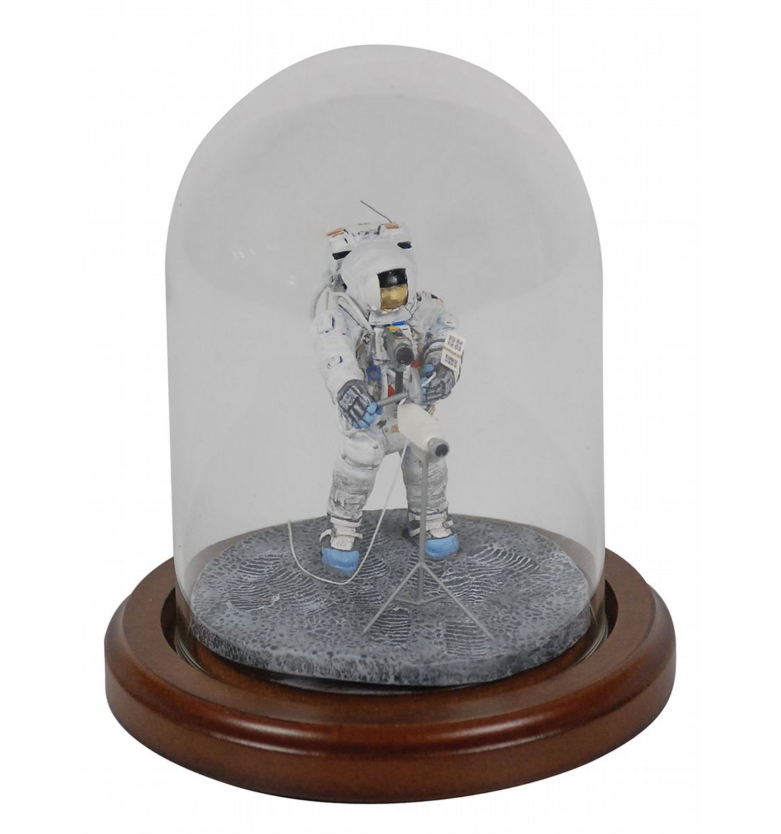 Detailed astronaut model, measuring approximately 2.5? tall, of Alan Bean attempting to repair his camera with a hammer. Figurine is attractively presented atop a wooden base with a glass dome cover. In fine condition.