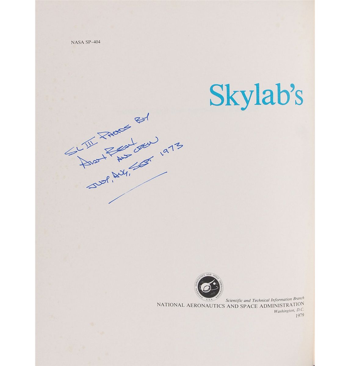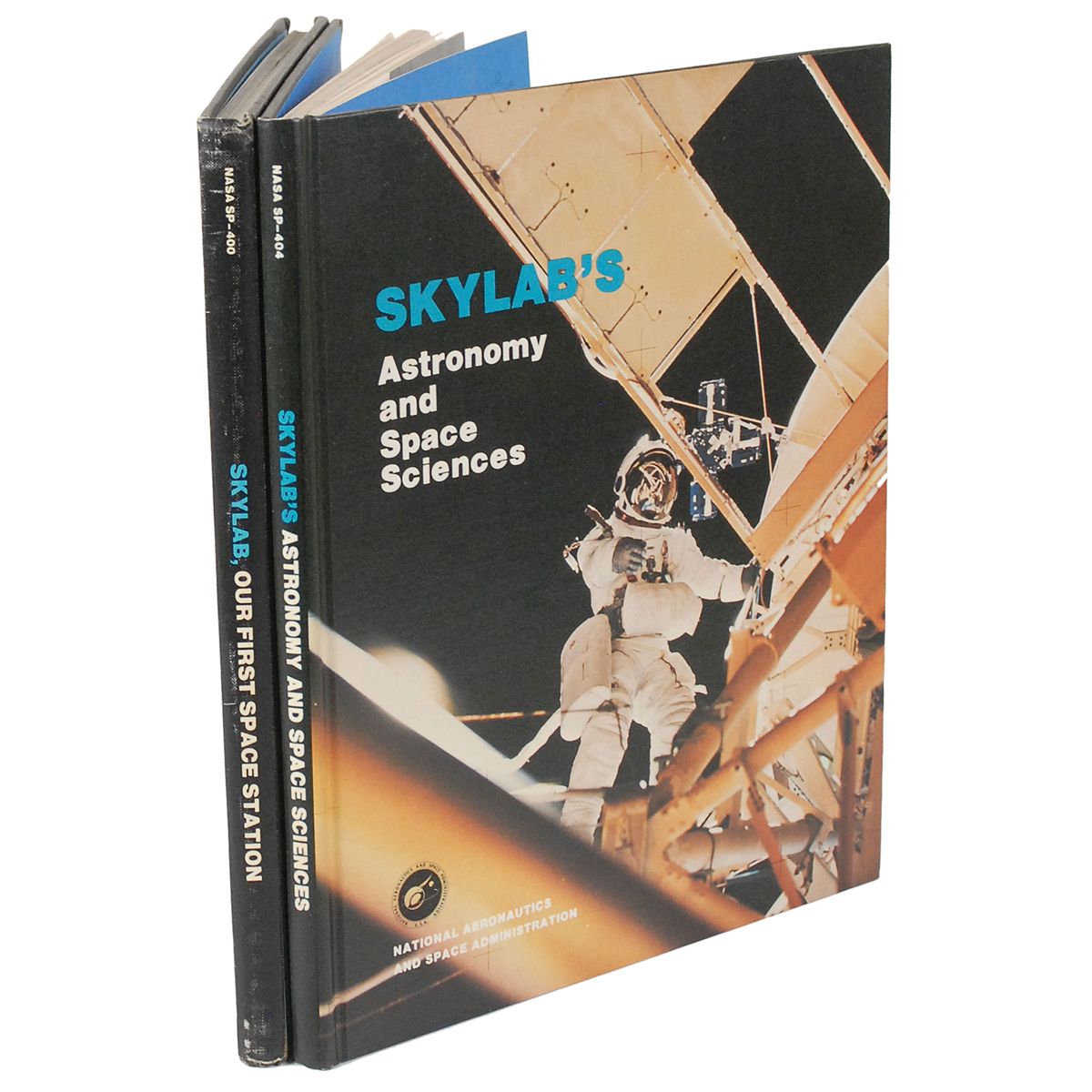 Two hardcover books: Skylab’s Astronomy and Space Sciences, signed on the title page in blue felt tip, “SL III photos by Alan Bean and crew, July, Aug, Sept 1973”; and Skylab, Our First Space Station, signed “Alan Bean, Skylab II CDR.” In fine condition, with some light rippling to opening pages and light cover wear.
