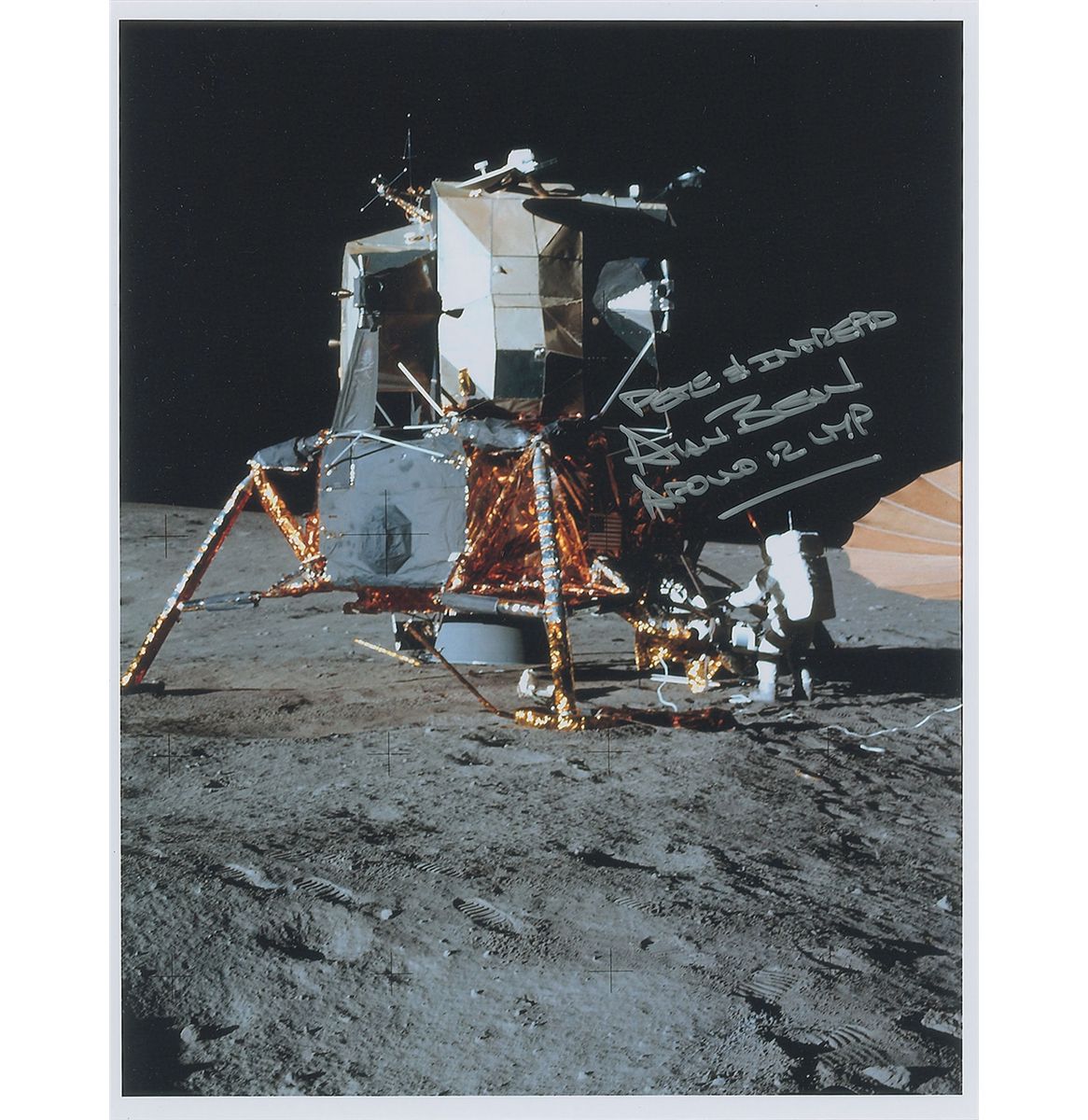Color glossy 11 x 14 photo of Charles Conrad next to the Lunar Module, signed in silver ink, “Pete & Intrepid, Alan Bean, Apollo 12 LMP.” In very fine condition.