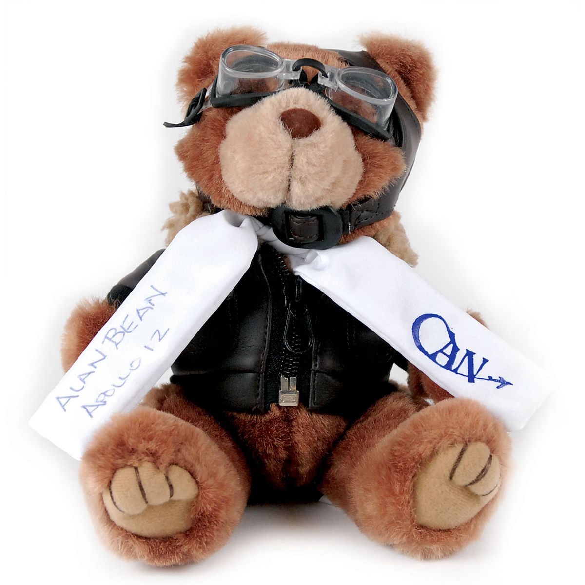 Stuffed Corporate Angel Network charity teddy bear wearing a leather flight jacket, scarf, cap, and goggles, approximately 6.5? tall, signed on the white scarf in blue ink, “Alan Bean, Apollo 12,” and signed again in silver ink on the back of the leather jacket. In very fine condition. The Corporate Angel Network flies cancer patients on corporate aircraft for treatment across the United States at no cost to the patient. Bean’s wife, Leslie, was instrumental in making the patient experience at the MD Anderson Cancer Center in Houston as comfortable as possible. All net proceeds from the sale of this bear will be donated directly to the Corporate Angel Network.