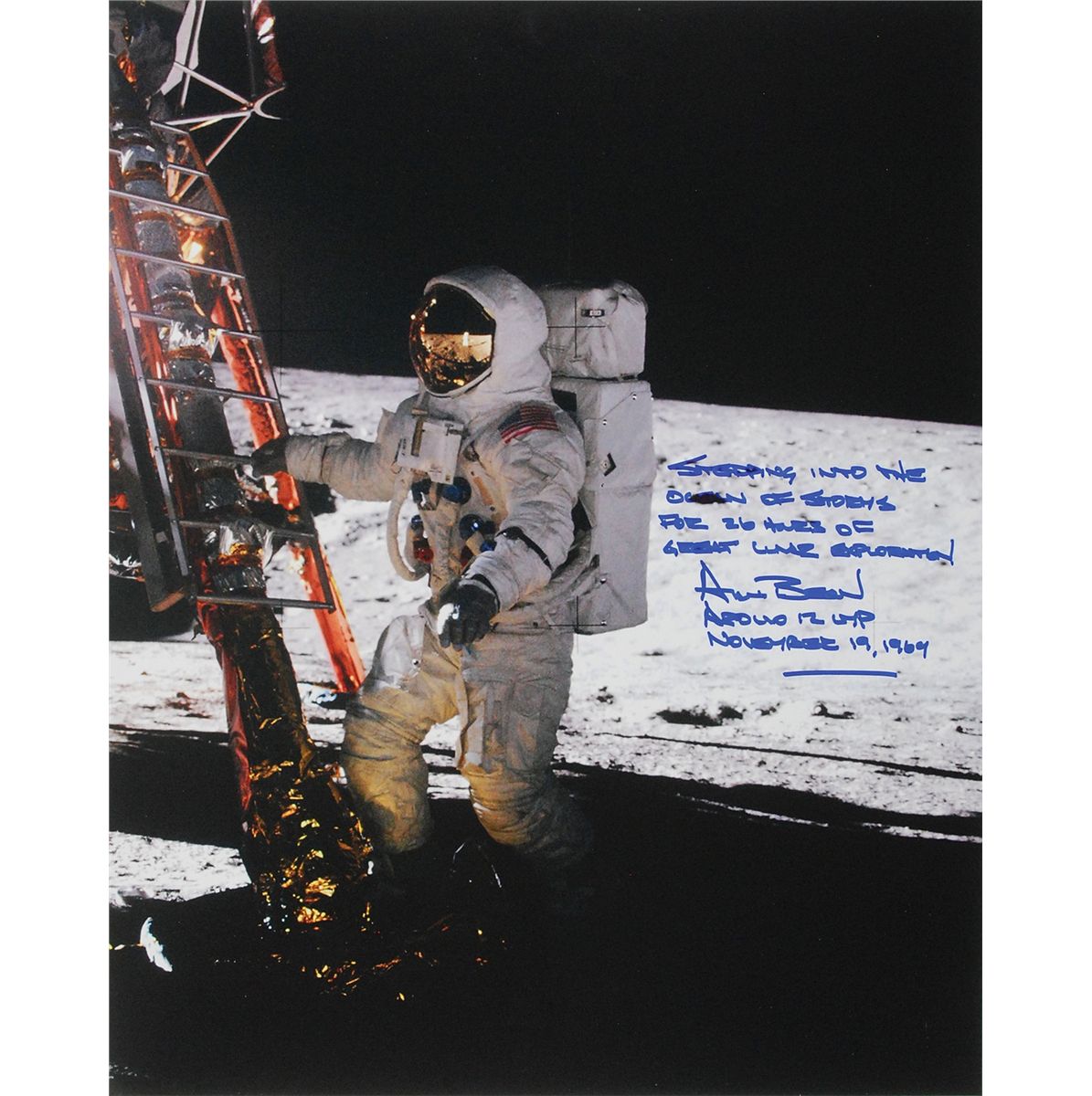 Color satin-finish 16 x 20 photo of Bean stepping foot on the lunar surface, signed in blue felt tip, “Stepping into the Ocean of Storms for 26 hours of great lunar exploration. Alan Bean, Apollo 12 LMP, November 19, 1969.” In very fine condition.