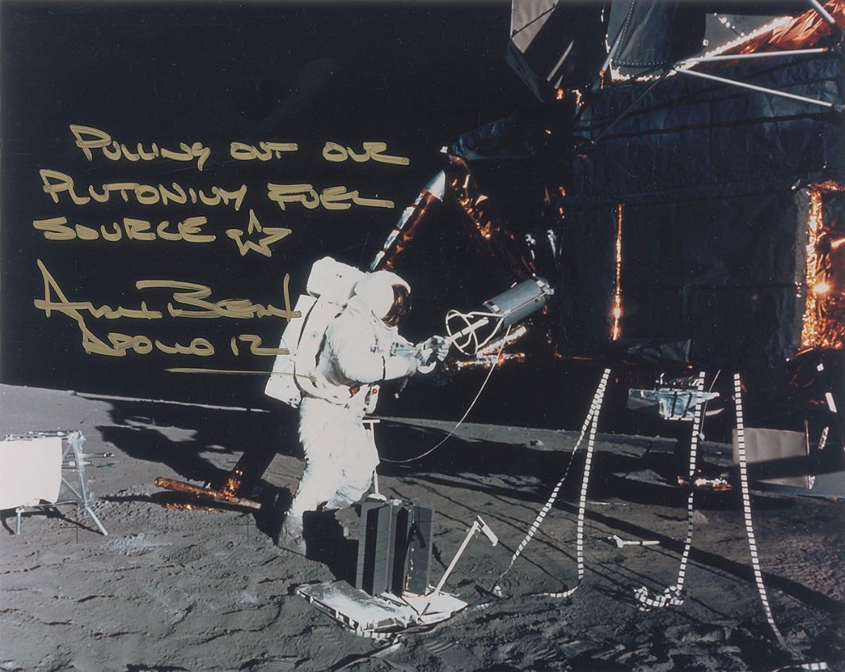 Color satin-finish 10 x 8 photo of Bean on the lunar surface during preparation for the ALSEP deployment, signed in gold ink, “Pulling out our plutonium fuel source, Alan Bean, Apollo 12.” In fine condition. Consignor notes that the signature was obtained in person at a UACC show.