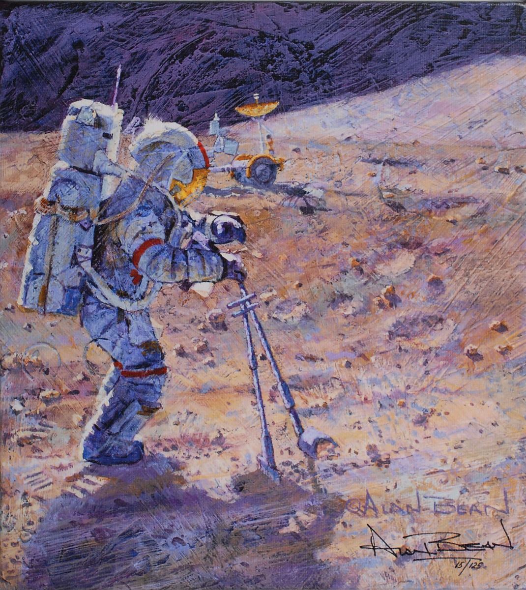 Wonderful limited edition color 11 x 12 giclee print on stretched canvas of an Alan Bean painting entitled ‘Tools of Our Trade,’ numbered 15/125, signed in the lower right in black felt tip by Bean. In fine condition.