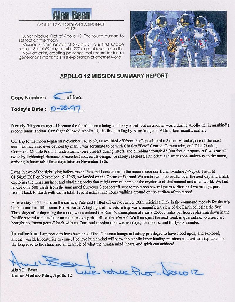 Limited edition printed Apollo 12 mission summary report, no. 5/5, one page, 8.5 x 11, dated October 20, 1997. Summary reads, in part: “Pete and I descended to the Moon and…landed on the Ocean of Storms…We made two moonwalks over the next day and a half, exploring the lunar surface and obtaining rocks that might unravel some of the mysteries of the ancient and alien world.” Signed at the conclusion in blue felt tip, “Alan Bean, Lunar Module Pilot—Apollo 12.” Bean has added the date and copy number in his own hand. In fine condition, with slight bleeding to ink.