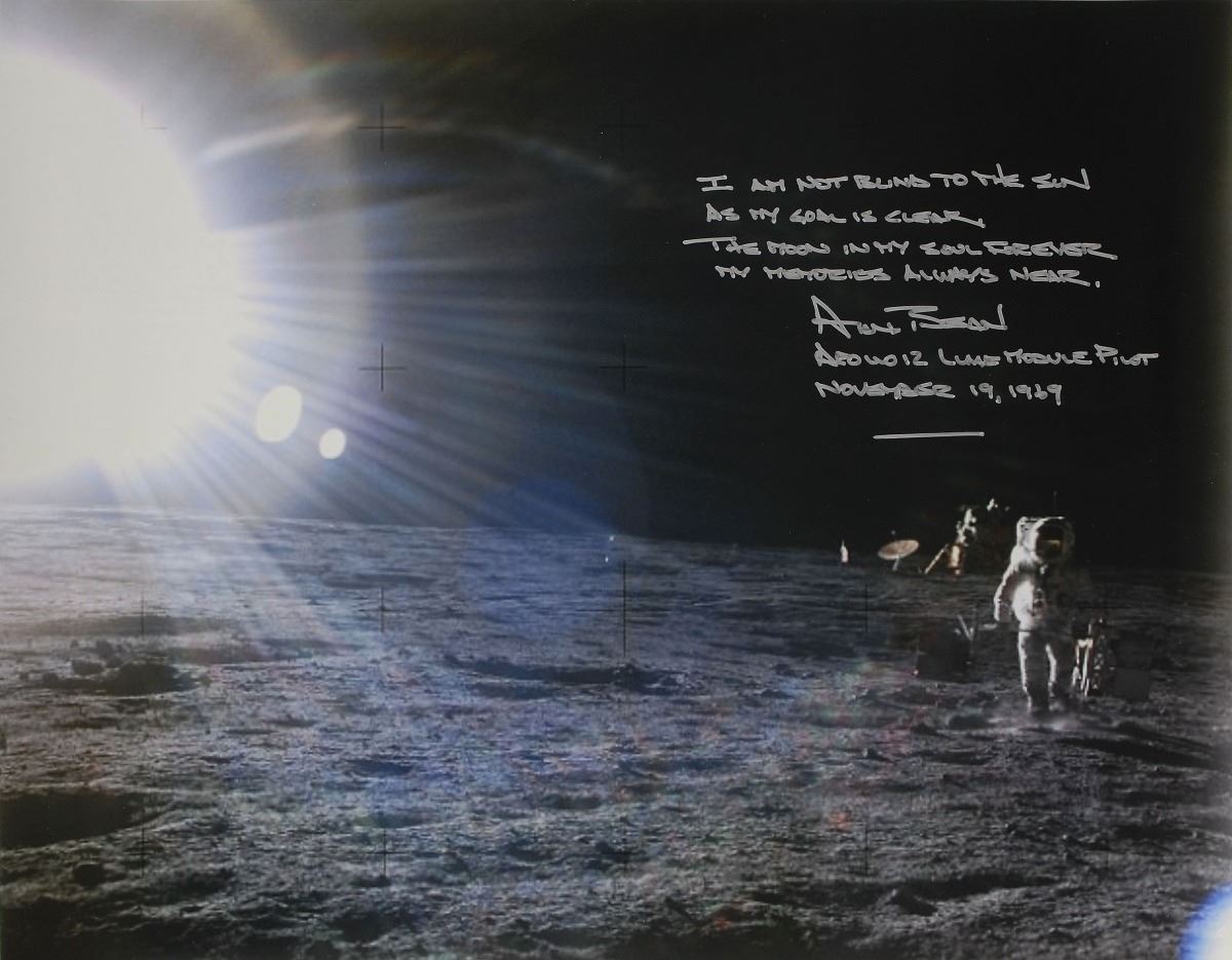 Color satin-finish 20 x 15.5 photo of Bean carrying the ALSEP away from the lunar module, signed in silver ink, “I am not blind to the sun, as my goal is clear, the moon in my soul forever, my memories always near. Alan Bean, Apollo 12 lunar module pilot, November 19, 1969.” In fine condition. Accompanied by an unsigned photo of Bean taken at the time of signing.