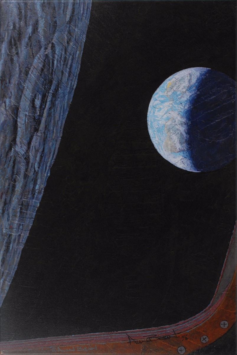 Color limited edition 16 x 24 giclee print on stretched canvas of an Alan Bean painting entitled ‘A Window on the End of an Era,’ numbered 15/80, signed along the bottom in black felt tip by Bean. In very fine condition.
