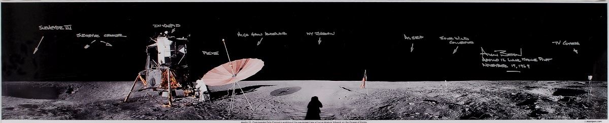 Impressive color glossy 50 x 10 panoramic photo of the Apollo 12 landing site at the Ocean of Storms, showing Commander Charles Conrad working at the equipment bay of the Intrepid, signed in silver ink, “Alan Bean, Apollo 12 lunar module pilot, November 19, 1969.” Bean has notated the various interesting features and landmarks of the landing area, including Conrad, the Surveyor crater, the ALSEP package, the solar wind collector, and even his own shadow. Rolled and in fine condition.