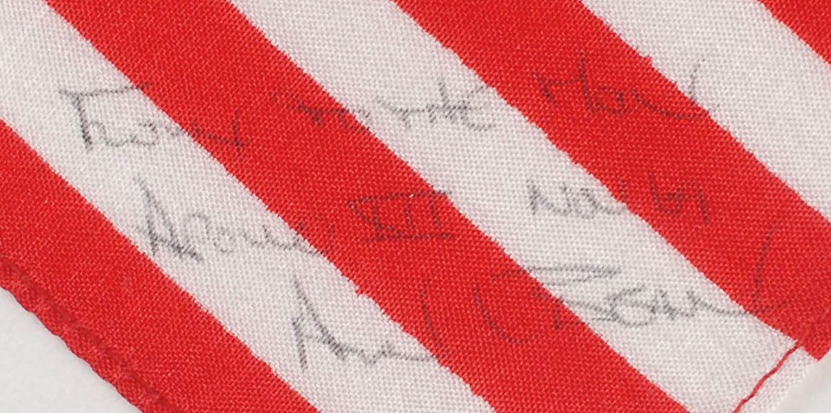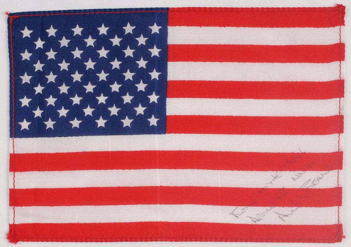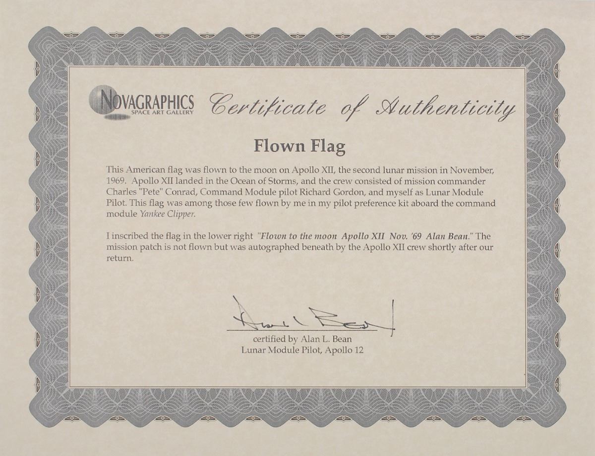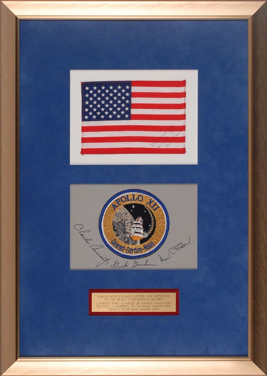 Flown fabric American flag carried to the moon on the Apollo 12 mission, 6 x 4, signed and flight-certified in the lower right in black ink, “Flown to the Moon, Apollo XII Nov. 69, Alan Bean.” Affixed to a slightly larger card and attractively matted above a plaque and 7 x 5 card bearing an affixed Apollo 12 mission patch, signed in black felt tip by crew members Charles Conrad, Dick Gordon, and Alan Bean. Framed to an overall size of 15.25 x 21.5. In fine condition. Accompanied by a signed certificate of authenticity from Bean, in part: “This flag was among those few flown by me in my pilot preference kit aboard the command module Yankee Clipper...The mission patch is not flown but was autographed beneath by the Apollo XII crew shortly after our return.” An exceptionally appealing flown flag with rock-solid provenance from the mission’s LMP. The Leon Ford Collection.