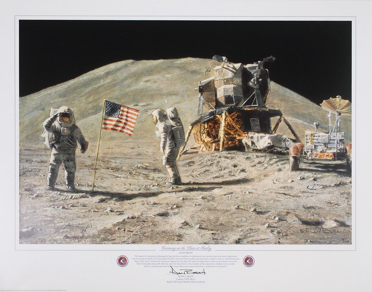 Patriotic color limited edition 27 x 21 lithograph of Alan Bean’s painting entitled ‘Ceremony on the Plain at Hadley,’ 15/150, signed in the lower border in black felt tip by Bean. Housed in its original Greenwich Workshop folder. In fine condition, with a ding to upper right edge.