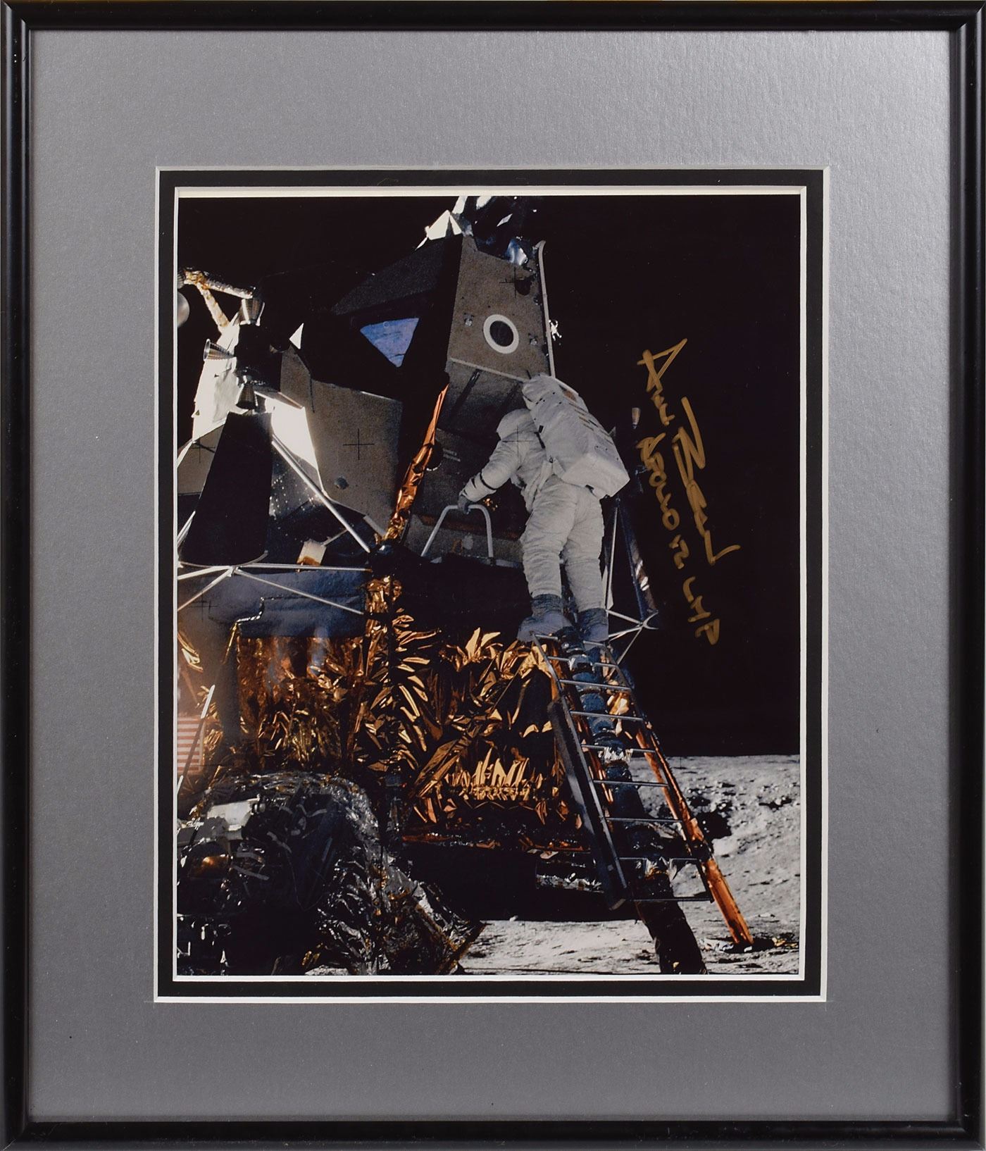 Color semi-glossy 7.75 x 9.75 full-length photo of Bean descending the ladder of the Lunar Module Intrepid, signed in gold ink, "Alan Bean, Apollo 12 LMP." Double-matted and framed to an overall size of 12.25 x 14.25. In very fine condition.