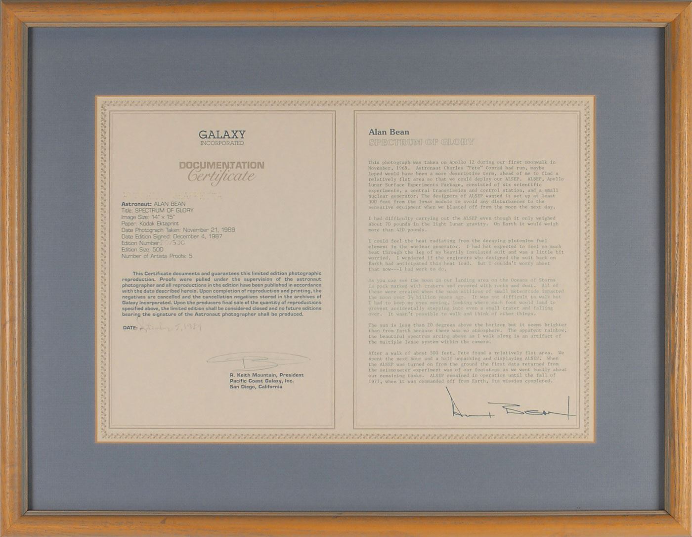 Surreal limited edition color reproduction photo entitled ‘Spectrum of Glory,’ 15.5 x 18.5, numbered 20/500, depicting CDR Charles Conrad working on the lunar surface during the first moonwalk of Apollo 12, signed in the lower border in black felt tip by Alan Bean. Matted and framed to an overall size of 21.75 x 25. In fine condition. Accompanied by a documentation certificate from Pacific Coast Galaxy Inc., which bears a printed narrative by Bean describing the photo, matted and framed to an overall size of 20.75 x 16.