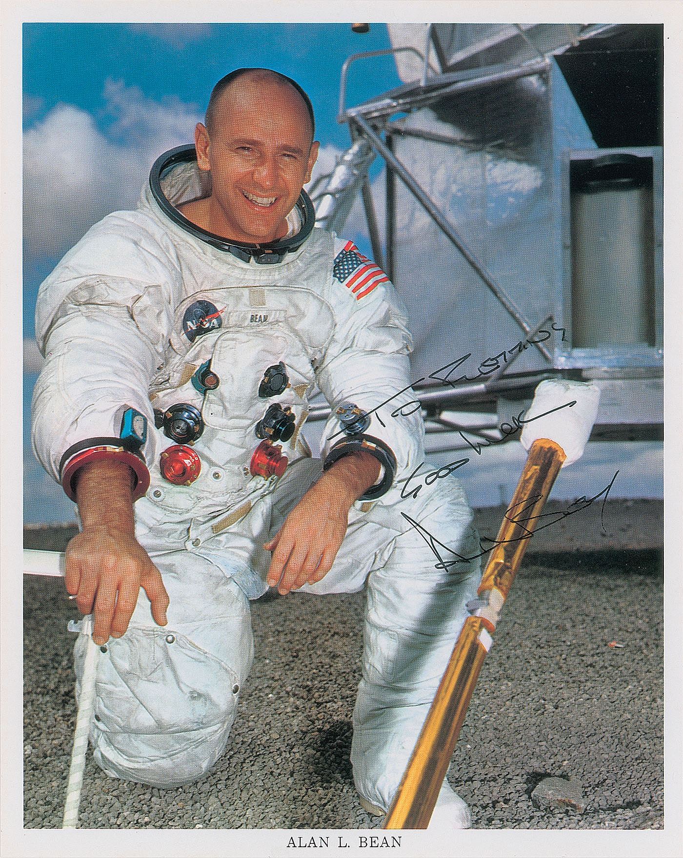 Official color 8 x 10 NASA lithograph of Bean posing in his white space suit in front of the lunar module, signed and inscribed in black ink, "To Flemming, Good luck, Alan Bean.” In fine condition.