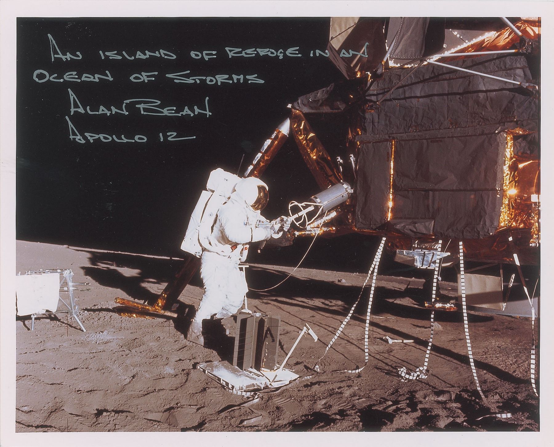 Color semi-glossy 10 x 8 photo of Bean making adjustments to the lunar module, signed neatly in silver ink, “An island of refuge in an ocean of storms, Alan Bean, Apollo 12.” In very fine condition.
