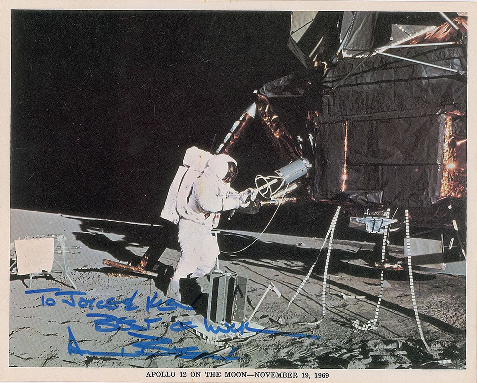 Official color 10 x 8 NASA lithograph of Bean using a fuel transfer tool on the Lunar Module during an Apollo 12 EVA, signed and inscribed in blue felt tip, "To Joyce & Ken, Best of Luck, Alan Bean.” Reverse bears a typed collector's notation indicating that it was signed in 1990. In very good to fine condition, with some light surface creasing, and a paperclip impression to the top edge.