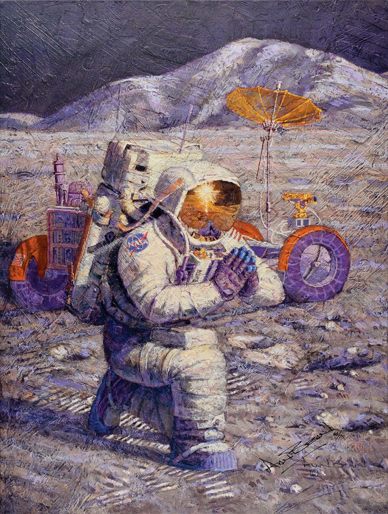 Gorgeous limited edition color 18 x 24 giclee print on stretched canvas of an Alan Bean painting entitled 'We Came in Peace for All Mankind,' numbered 60/75, showing Apollo 15 moonwalker Jim Irwin praying on the lunar surface, signed in the lower right in black felt tip by Bean. In fine condition. Accompanied by a certificate of authenticity from Greenwich Workshop.