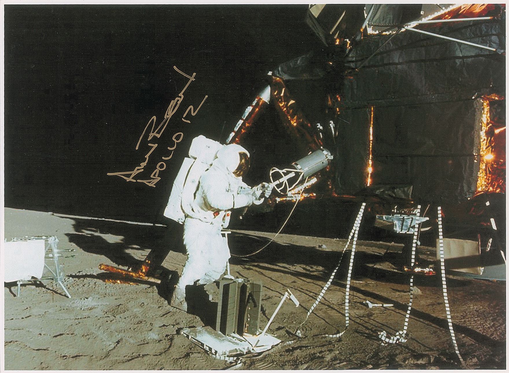 Color 11.25 x 8.25 laserprint photo of LMP Bean using a fuel transfer tool on the Lunar Module during an Apollo 12 EVA, signed in gold ink, "Alan Bean, Apollo 12." In very fine condition.