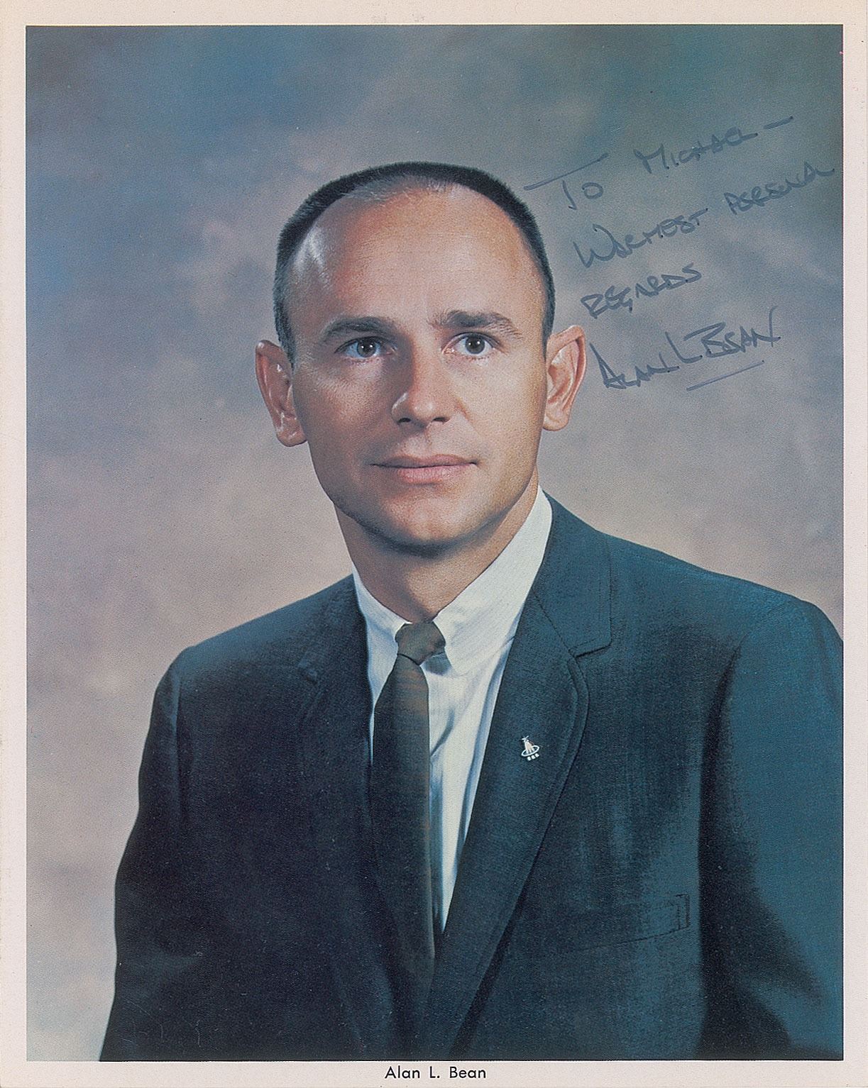 Official color 8 x 10 NASA lithograph of Bean wearing a suit and tie, with an astronaut pin on his lapel, signed and inscribed in black felt tip, "To Michael—Warmest personal regards, Alan L. Bean.” In fine condition, with a light paperclip impression to the top edge, and adhesive residue on the back from onetime storage in a magnetic photo album.