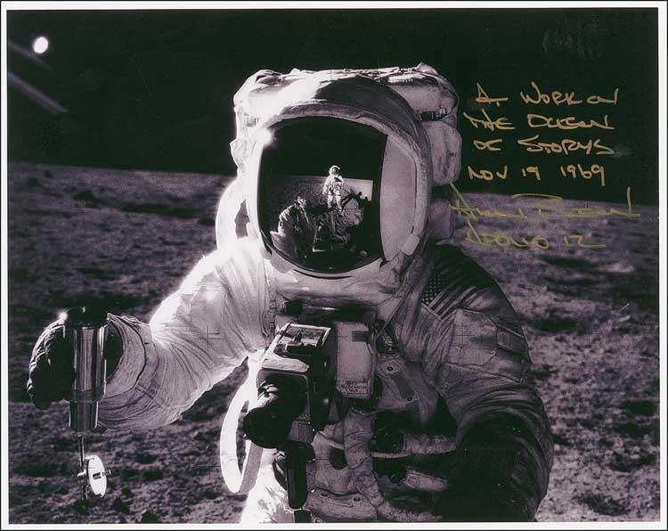 Eye-catching color 10 x 8 laserprint photo of Bean on the moon, signed in gold ink, “At Work on the Ocean of Storms, Nov 19, 1969, Alan Bean, Apollo 12.” In fine condition, with slight discoloration to portions of ink in signature and inscription. Pre-certified Scott Cornish and RRAuction COA.