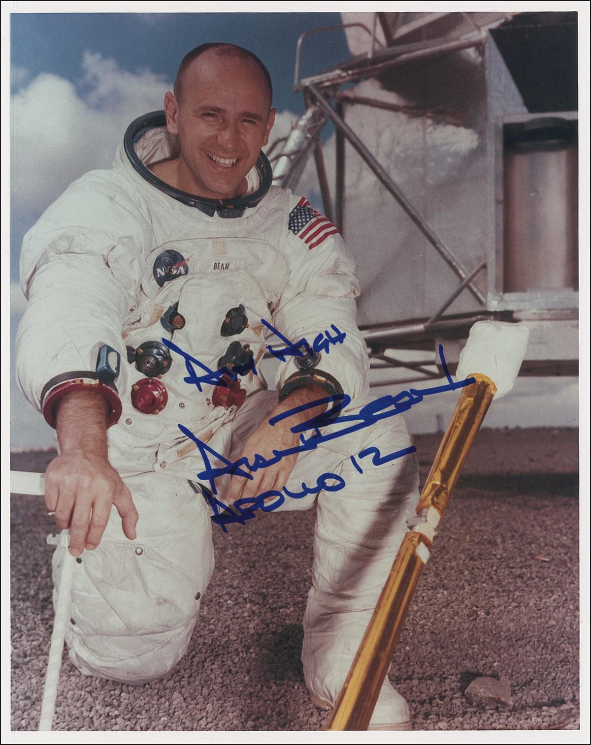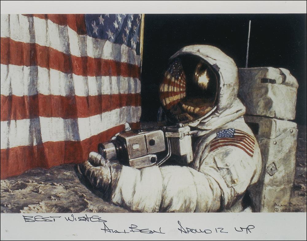 Color satin-finish 8 x 10 photo of Bean posing during training, signed in blue felt tip, “Aim High, Alan Bean, Apollo 12”; and a color glossy 10 x 8 photo of one of Bean’s artworks, signed in black ink, “Best wishes, Alan Bean, Apollo 12 LMP.” In fine condition. Pre-certified Scott Cornish and RRAuction COA.