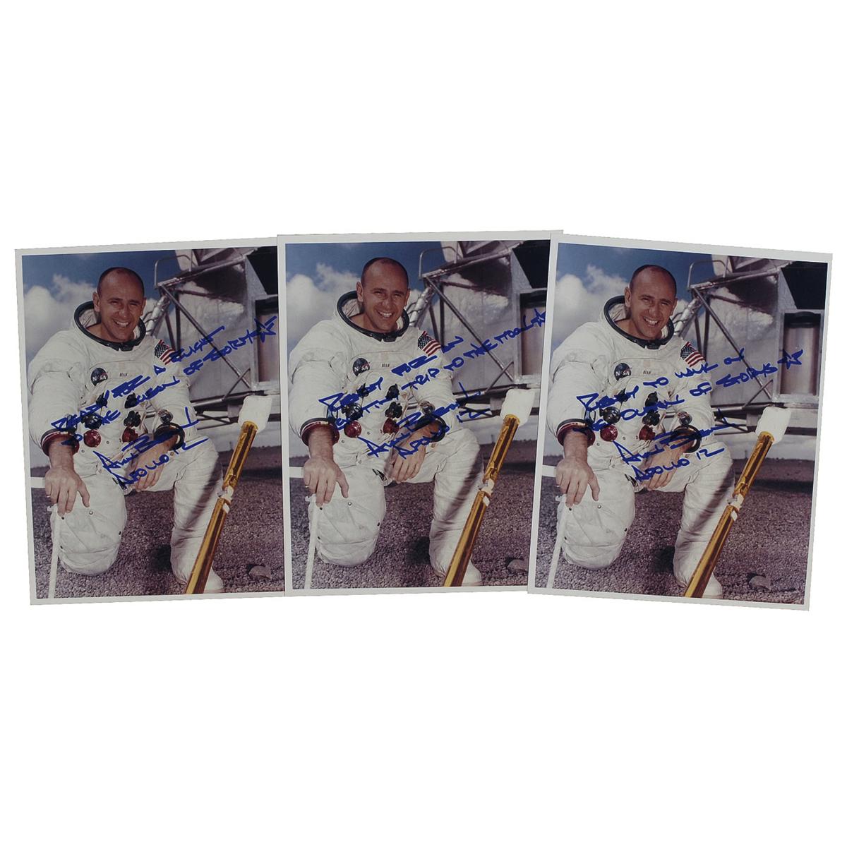 Three identical color satin-finish 8 x 10 photos of Bean during training, each signed in blue felt tip, adding a lunar-related sentiment to each photo. In very fine condition.