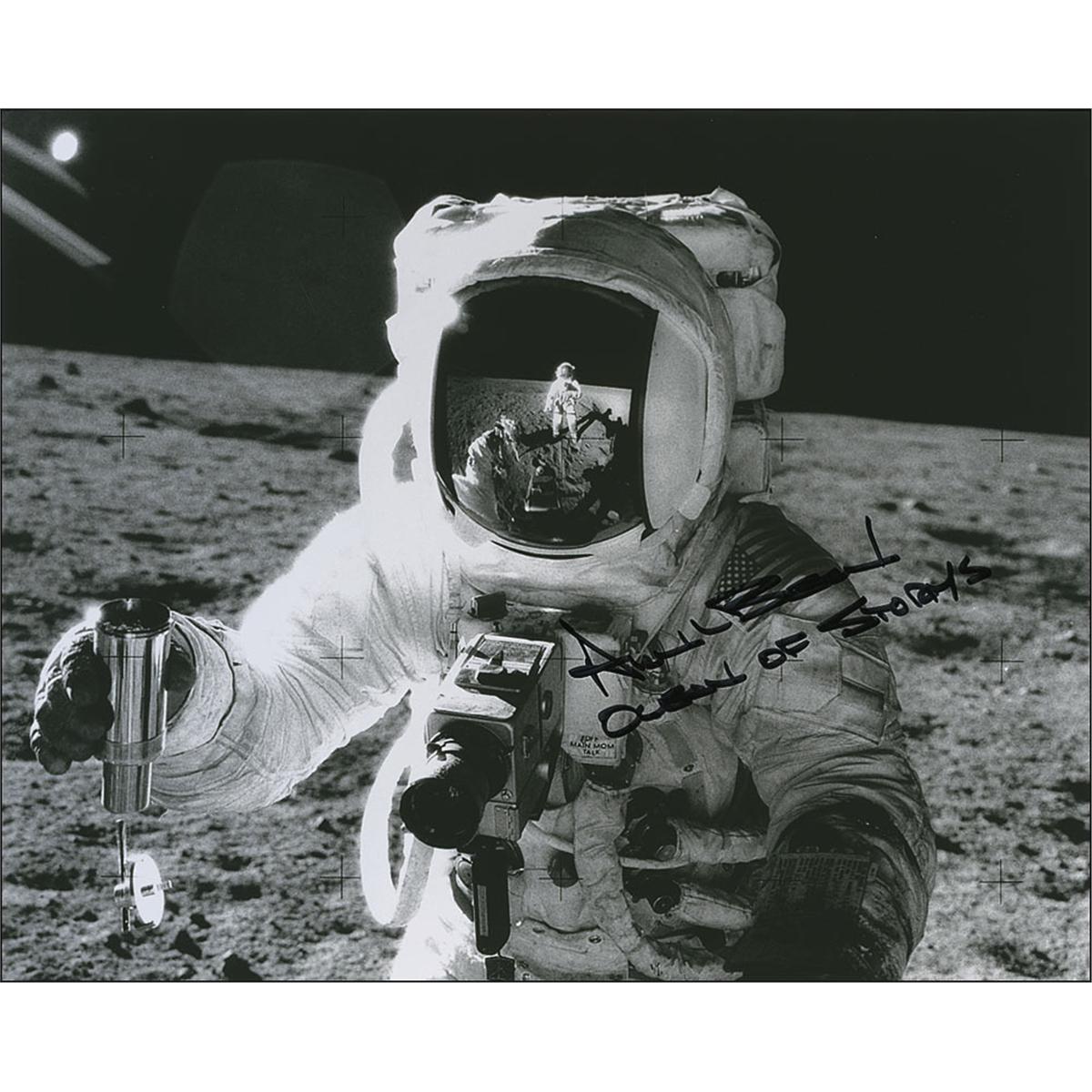 Satin-finish 10 x 8 photo of Bean on the lunar surface, signed in black felt tip, “Alan Bean, Ocean of Storms.” In very fine condition.