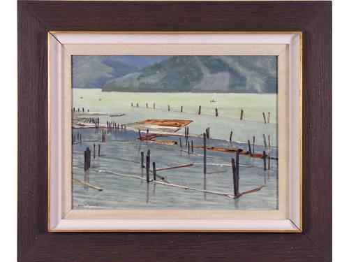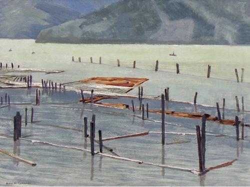 [Canadian, OSA, RCA, 1911-1990] LOG DUMP, BELLA COOLA Oil on board 12 x 16 ins. -Signed & titled