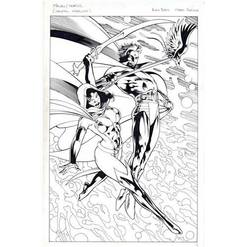 <B>Alan Davis and Mark Farmer - Ultraverse/Marvel Dream Team #1 Back Cover Original Art (Malibu, 1995).</B></I> Malibu Comics' Ultra warrior woman, Mantra, and Marvel's Adam Warlock, are captured in mid-flight by the extremely talented Alan Davis, in this back cover from <B>Ultraverse/Marvel Dream Team</B></I> #1. Davis has crafted stories for comics including <B>JLA</B></I>, <B>JSA</B></I>, <B>The Legion of Super-Heroes</B></I>, <B>Batman and the Outsiders</B></I>, <B>2000 A.D.</B></I>, <B>The Fantastic Four</B></I>, <B>The Uncanny X-Men</B></I>, and many more. Capably inked by Mark Farmer, this art has an image area of 10" x 15" and the condition is Excellent.