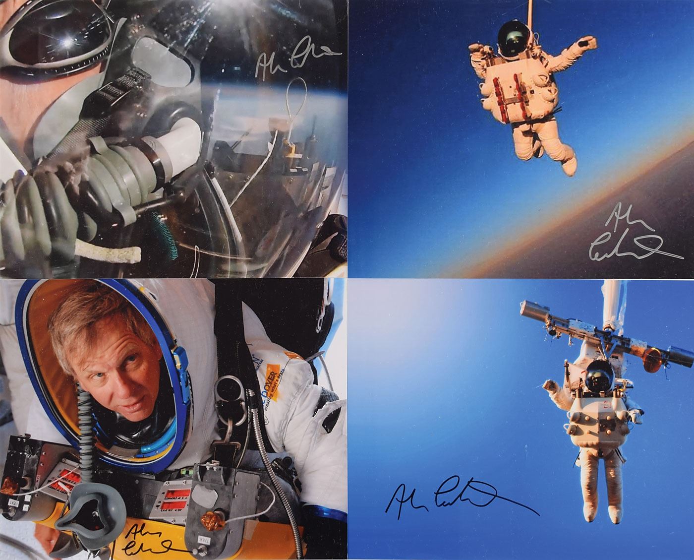 Four color glossy 10 x 8 photos of Alan Eustace during or preparing for his world record highest-altitude free-fall jump, each signed in silver ink or black felt tip. In overall fine condition, with some slight lower edge creasing. Accompanied by a Skydiving Museum and Hall of Fame business card belonging to Eustace, who has signed the reverse in black felt tip.