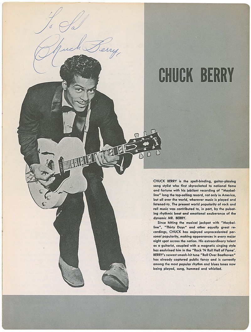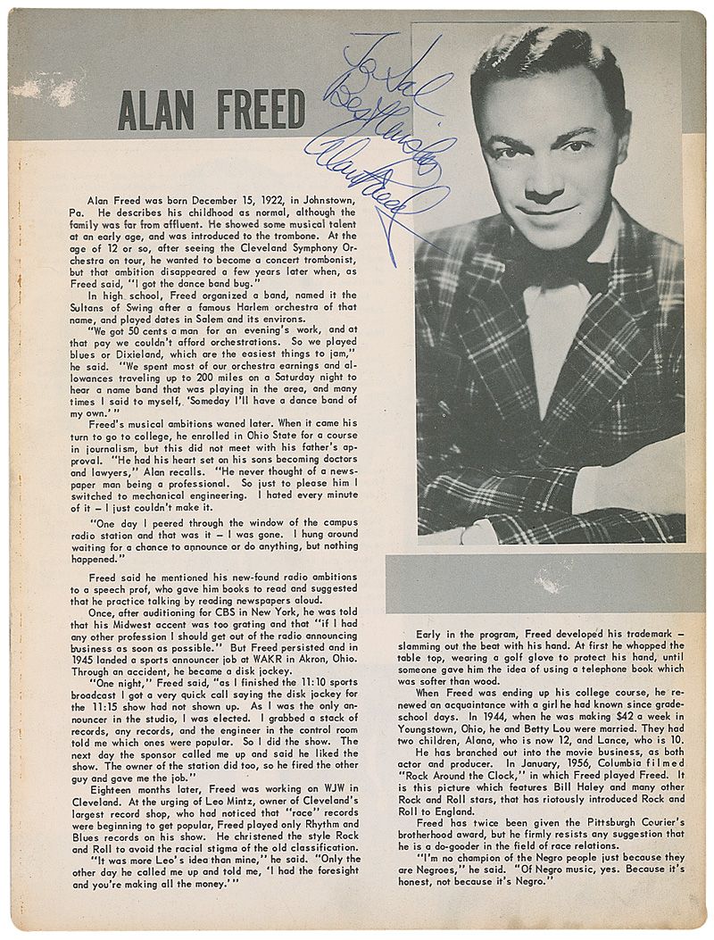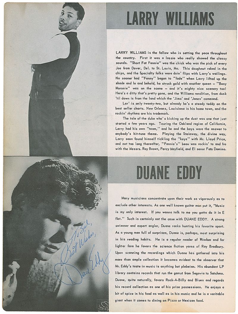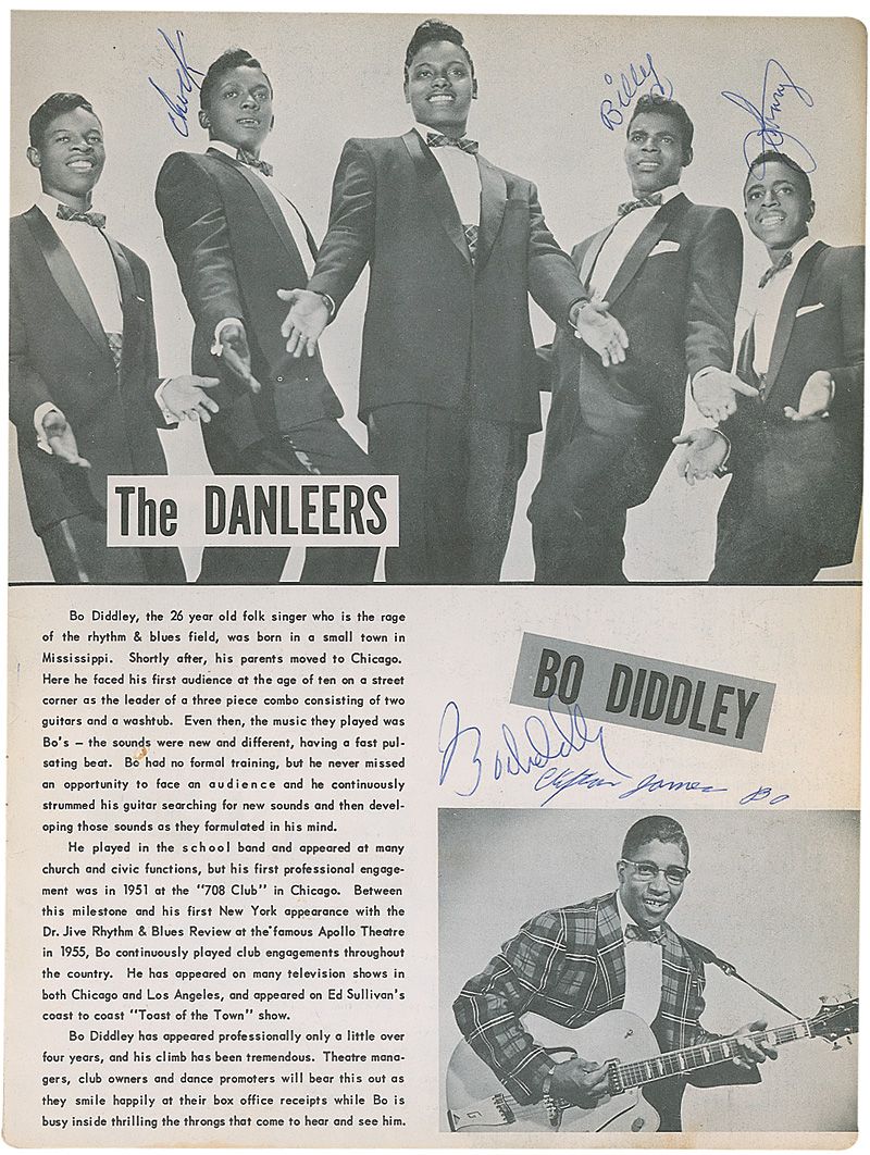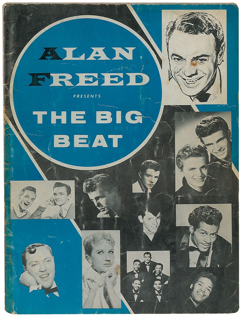 Original vintage program from “Alan Freed presents The Big Beat,” 9 x 12, signed inside in blue ballpoint by 29 performers, most inscribed, including Alan Freed, Chuck Berry, Frankie Avalon, Duane Eddy, Bo Diddley, two members of the Elegants, Jimmy Clanton, the Kalen Twins, the Royal Teens, members of the Danleers, Bobby Freeman, and members of the Olympics. Both covers detached, scattered toning and soiling, creasing to covers, and expected handling wear, otherwise very good condition.