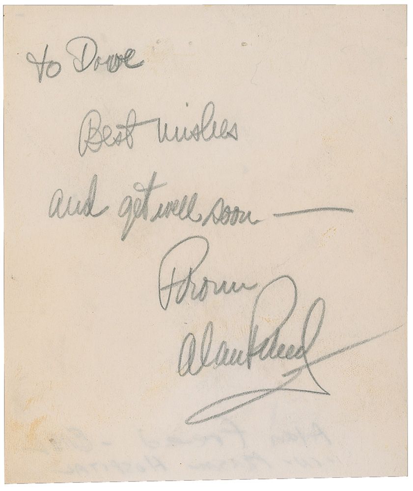 American disc jockey and promoter (1921–1965) who pioneered the broadcasting of R&B and rock and roll on the radio, resulting in an explosion of interest in these still-emerging genres in the early 1950s. His career ended in the late 1950s when it was revealed that he, in a pervasive practice of the era, had accepted bribes from record labels in exchange for airplay. The resulting ‘payola’ scandal resulted in legislation that made such actions illegal. Scarce vintage pencil signature and inscription, “To Dave, Best wishes and get well soon—From, Alan Freed,” on an off-white 4 x 4.75 sheet. Scattered creases and soiling, and a few staple holes to the top, otherwise fine condition.
