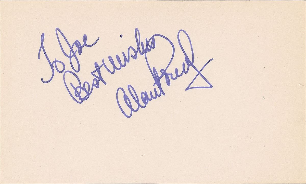American disc jockey and promoter (1921–1965) who pioneered the broadcasting of R&B and rock and roll on the radio, resulting in an explosion of interest in these still-emerging genres in the early 1950s. Uncommon ink signature and inscription, “To Joe, Best wishes, Alan Freed,” on an off-white 5 x 3 card. In fine condition.
