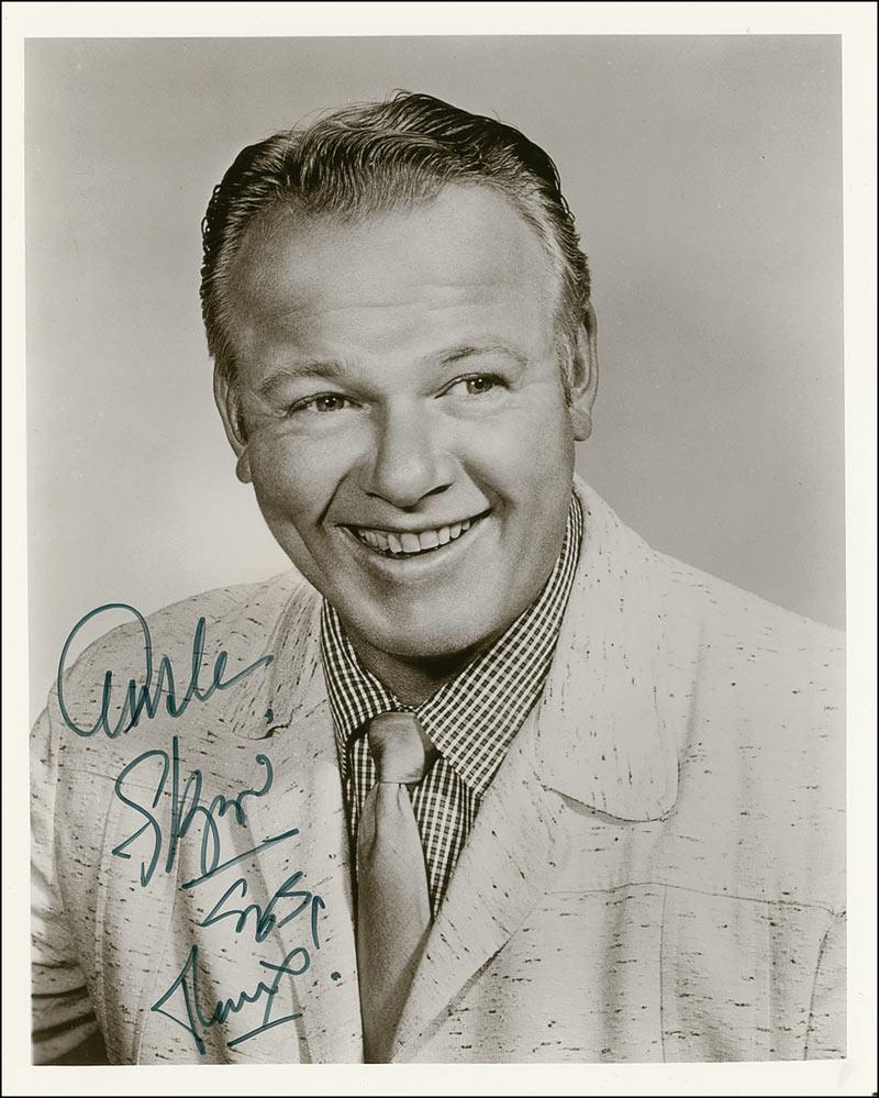 Glossy 8 x 10 photo of the burly actor in a coat and tie, signed in felt tip “Alan Hale, Skipper, SOS Thanx!” In fine condition.