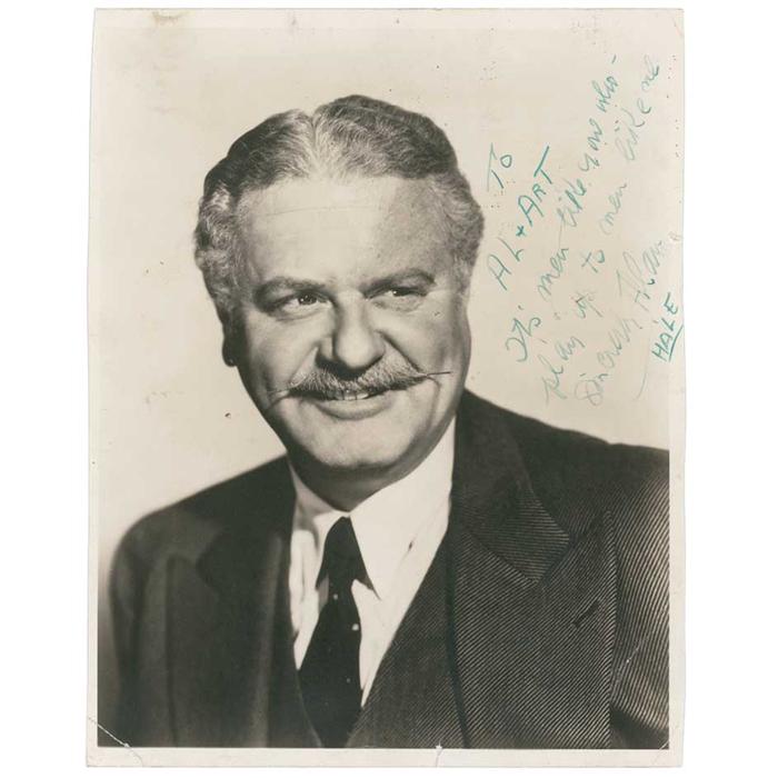 Vintage matte-finish 8 x 10 photo, signed and inscribed in green ink “To Al & Art, It’s men like you who play up to men like me. Sincerely, Alan Hale.” In very good condition, with scattered spotting to background, a crease to each corner, a couple small edge tears, tack hole to top border, and a few creases to image. Pre-certified PSA/DNA and RRAuction COA.