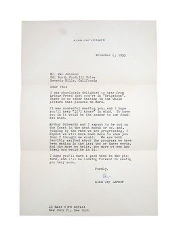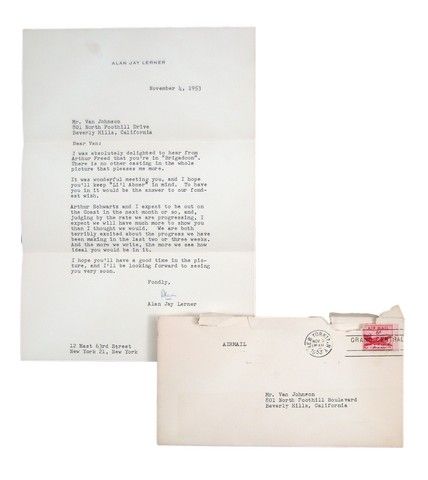Alan Jay Lerner Signed Personal Letter - Truly one of the most historic letters in the world of Musicals! From the legendary lyricist Alan Jay Lerner, known for such classics as “My Fair Lady”, “Gigi”, “Camelot”, “Paint Your Wagon”, Brigadoon”, “On A Clear Day”, “An American In Paris”, and “Royal Wedding”, to name just a few, comes this amazing letter (dated November 4th, 1953). It was written by Lerner to Van Johnson, congratulating Johnson, since he had just heard from equally legendary Motion Picture Musical producer Arthur Freed that Johnson had been cast in the lead in the movie version of “Brigadoon”. Of course the movie is based on Lerner’s smash hit Broadway musical. Of great interest is his mentioning of his production of “Li’l Abner”, which Lerner was writing with his new collaborator Arthur Schwartz. In the letter he asks Johnson if he would consider playing the lead in this new Broadway Musical based on the popular Al Capp comic strip. This was a much talked about production that eventually went through dozens of hands, including most of the greatest names in musical theater before finally being made over six years later without Lerner, Schwartz or Johnson! This rare letter on Lerner’s personal stationary is signed by Lerner with his first name: “Alan”. It comes with Lerner’s envelope stationary, postmarked November 5, 1953, with the original six cents Air Mail stamp with a cancelation from Grand Central Station in New York. The letter is from the personal collection of Van Johnson, and includes a Letter of Provenience from his daughter, Schuyler Johnson along with a copy of her famous controversial cover story article “My Life As A Hollywood Princess”, about her trials and tribulations growing up in Beverly Hills with a superstar father and extended “family” with some of the most famous celebrities in the world.