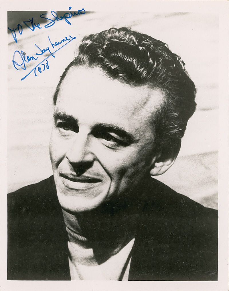 Glossy 8 x 10 close-up photo, signed and inscribed in blue felt tip “To the Shapiros, Alan Jay Lerner, 1978.” In very good condition, with scattered creases and impressions.
