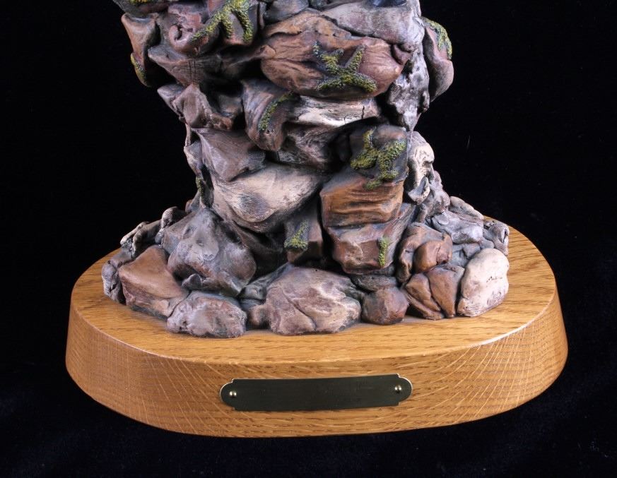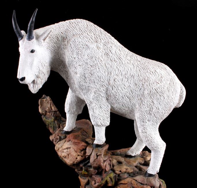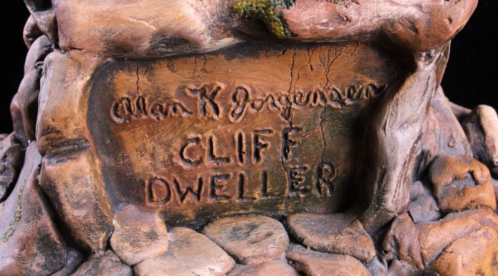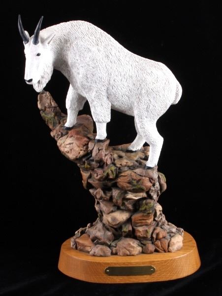 This is an original limited edition mountain goat sculpture by Alan Jorgensen. The piece is titled "Cliff Dweller" and was cast using a ground stone technique. The sculpture was then reworked by the artist and hand painted. The mountain goat shows incredibly fine detail as he stands on the rock ledge. The sculpture rests on a solid oak base with a brass plaque that reads "Cliff Dweller / Alan H. Jorgensen". The back of the sculpture is signed again by the artist and is numbered 154/1500. The piece shows good condition. It measures 11" W x 6.5" D and is 18" tall.