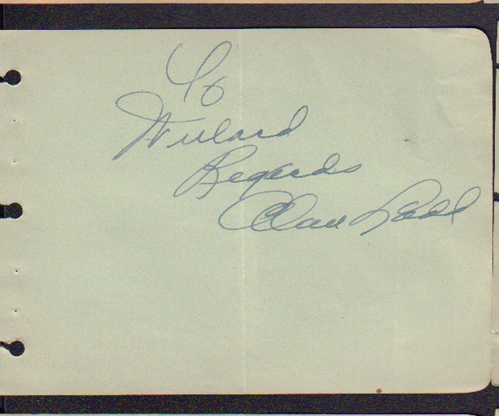 Autograph book page signed by Alan Ladd. It was inscribed to Willard. The page had been folded in half at some point. All items come with a certificate of authenticity good for the life of the piece.